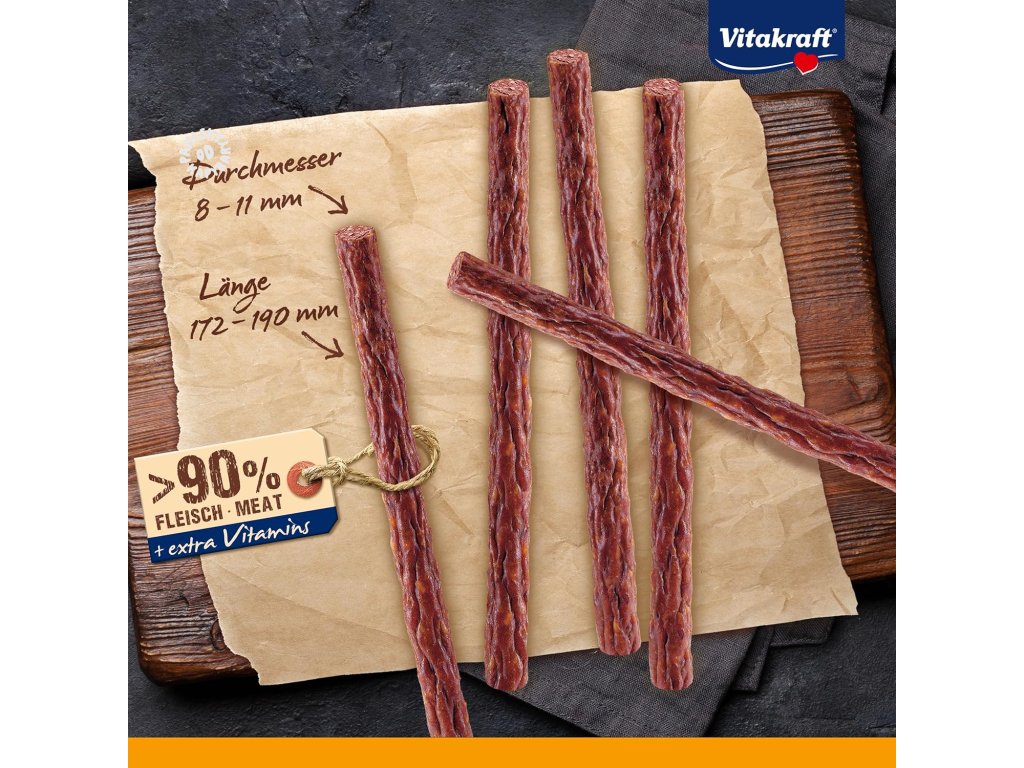 Tyčinka pro psy s vysokým obsahem masa je pamlsek, který si zamiluje každý pes. Nezáleží, jestli je to štěně, dospělý pes nebo senior. Tuhle tyčku budou milovat v každém věku. Neobsahuje žádné konzervační látky, aromata ani cukr. A aby byla pro psy ještě atraktivnější, je uzená na bukovém dřevě, což jí dodává ještě intenzivnější vůni a chuť (Ano, testovali jsme to i na sobě.)