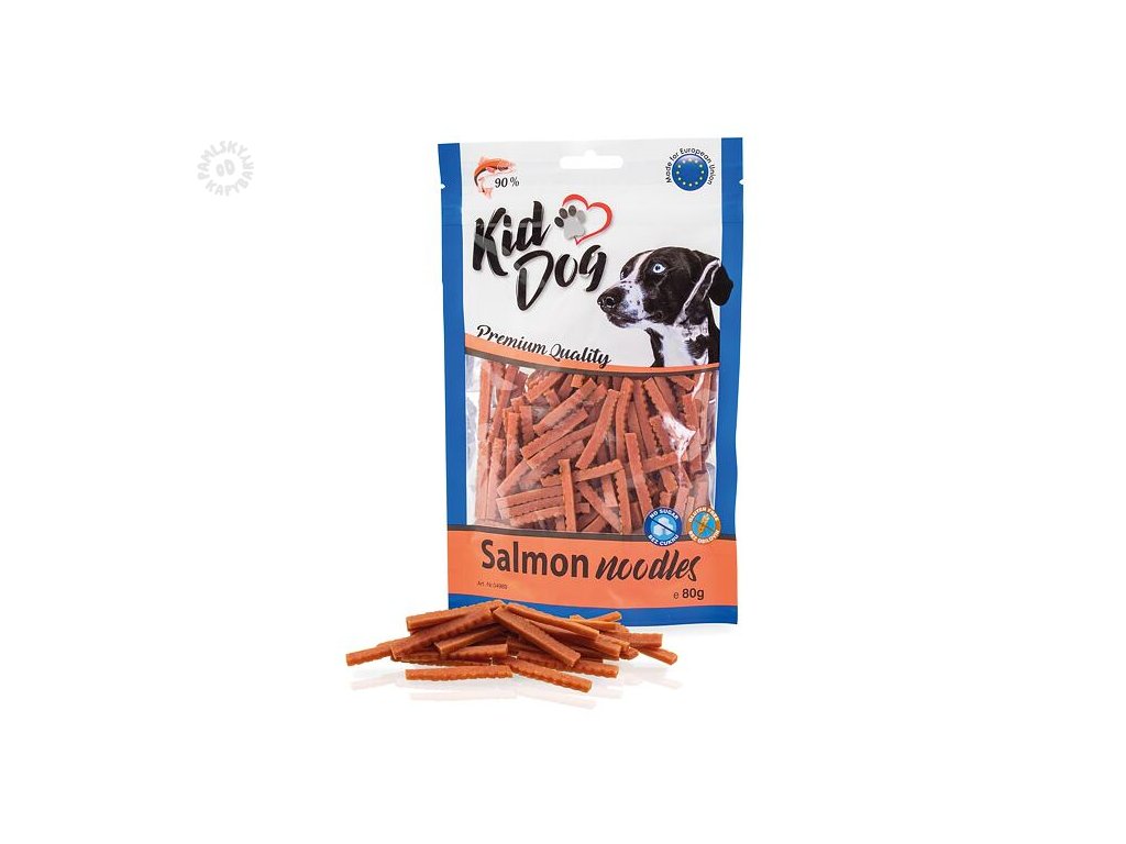 Lososí nudličky od firmy Kiddog premium jsou masovou pochoutkou pro psy s vysokým podílem rybího masa, který tvoří 90% celkového složení. Neobsahují obiloviny, jsou krásně měkké a mají nízký obsah tuku, což z nich dělá ideální odměnu při venčení, či výcviku. Díky přirozenému podílu omega-3 a omega-6 mastných kyselin pomáhá k vyživování srsti a kůže.