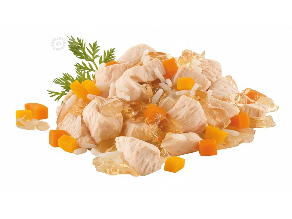 Masová kapsička Filetto s kousky trhaného kuřecího masa, dýní, mrkví a vařenou rýží v lahodném a jemném želé. Vše je připravováno při nízkých teplotách, aby se zachovaly všechny vitaminy a přirozené živiny.