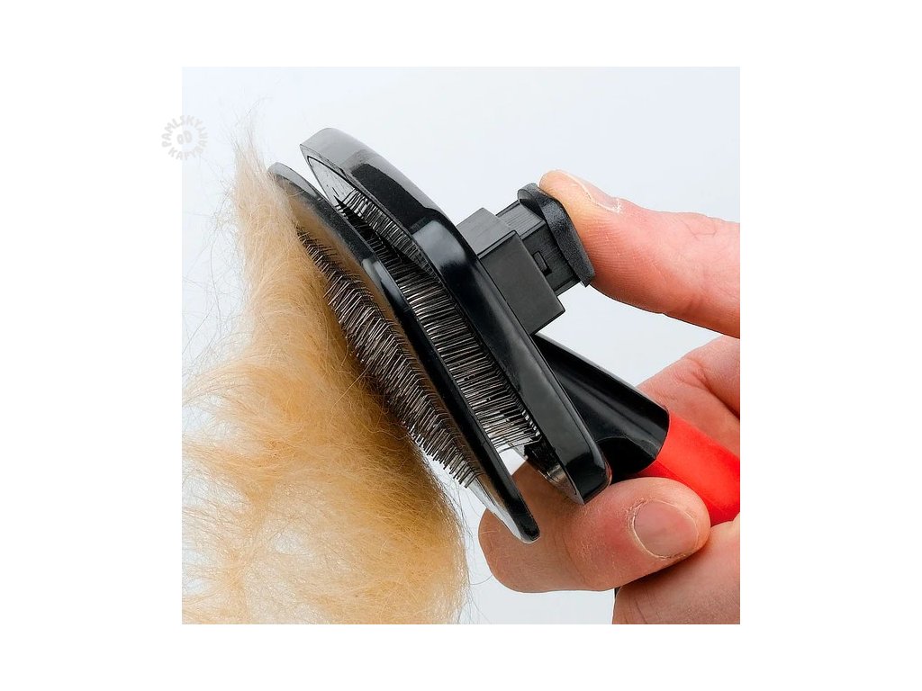 Tento kartáč na česání pro psy má speciální systém, který umožňuje snadné odstranění chlupů z kartáče. Jeho ohnuté štětiny z nerezového drátu odstraňují odumřelé chlupy z podsady vašeho psa, což usnadňuje pozdější použití hřebenu.